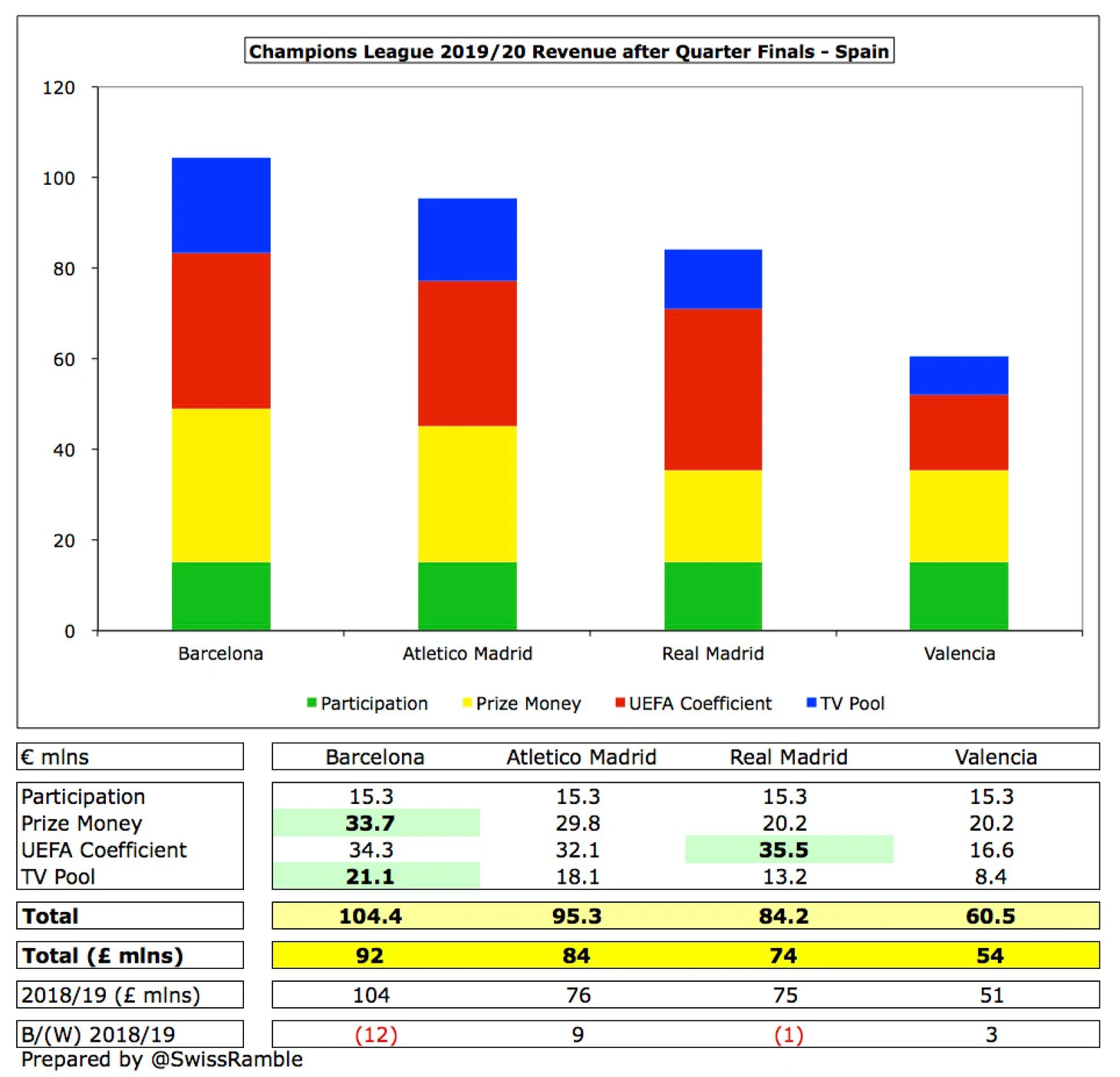 · У «Барселоны» самый высокий заработок среди испанских клубов – 104 миллиона. Затем идут «Атлетико» (95 миллионов), «Реал» (95) и «Валенсия» (61). Испания получила больше всех призовых благодаря высокому коэффициенту из-за шикарных результатов в предыдущие годы.