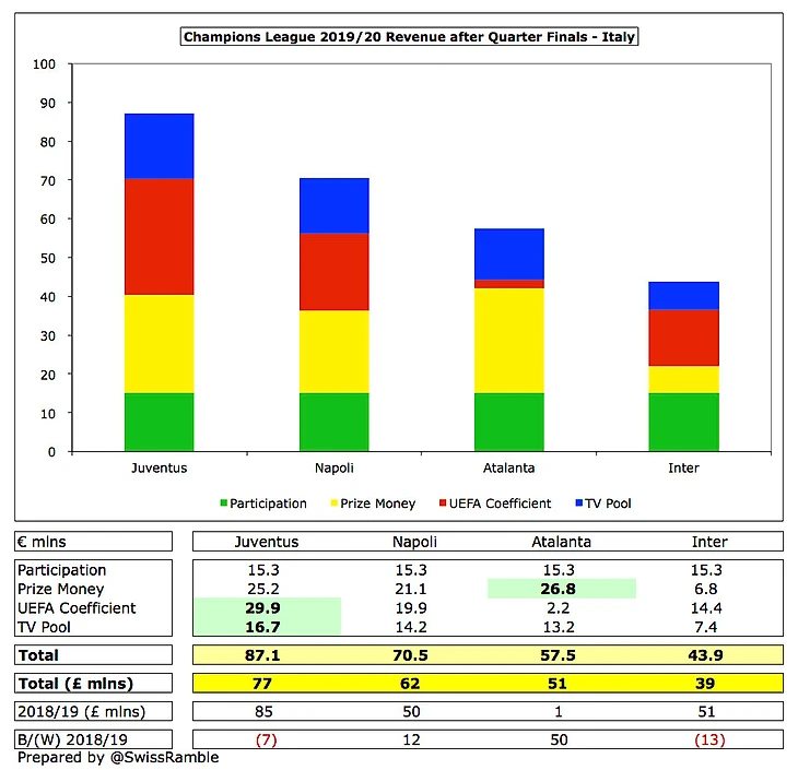 · У «Ювентуса» самый высокий доход от еврокубков среди итальянских команд – турниский клуб заработал 87 миллионов евро. Следом идут «Наполи» (70 миллионов), «Аталанта» (57) и «Интер» (44).