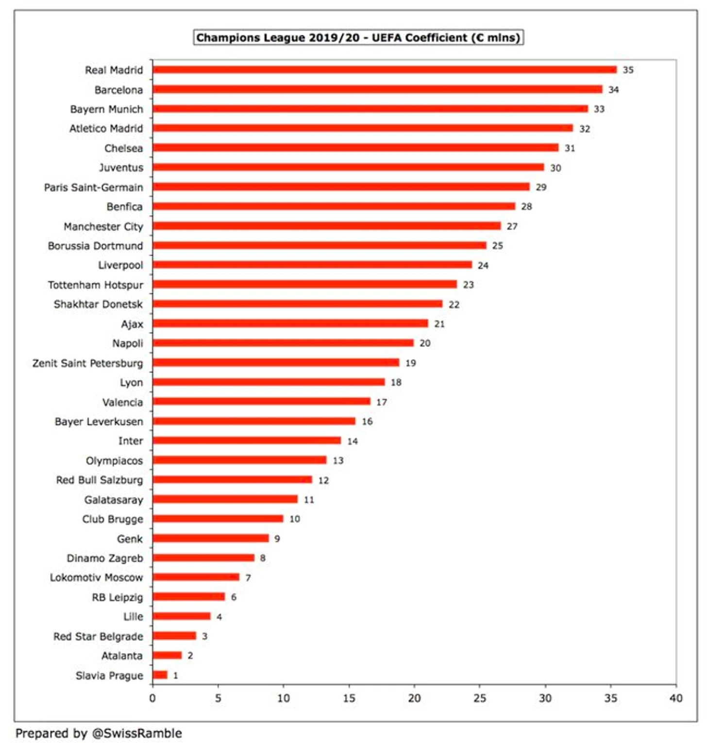 · Коэффициент УЕФА основан на выступлении в турнирах УЕФА за последние 10 лет, включая бонусные баллы за титулы. Банк в 585 миллионов делится на доли, поэтому «Реалу» прилетело 35,5 миллионов, а «Аталанте» – всего 2,2 миллиона. Минимальная сумма – 1,1 миллион евро.