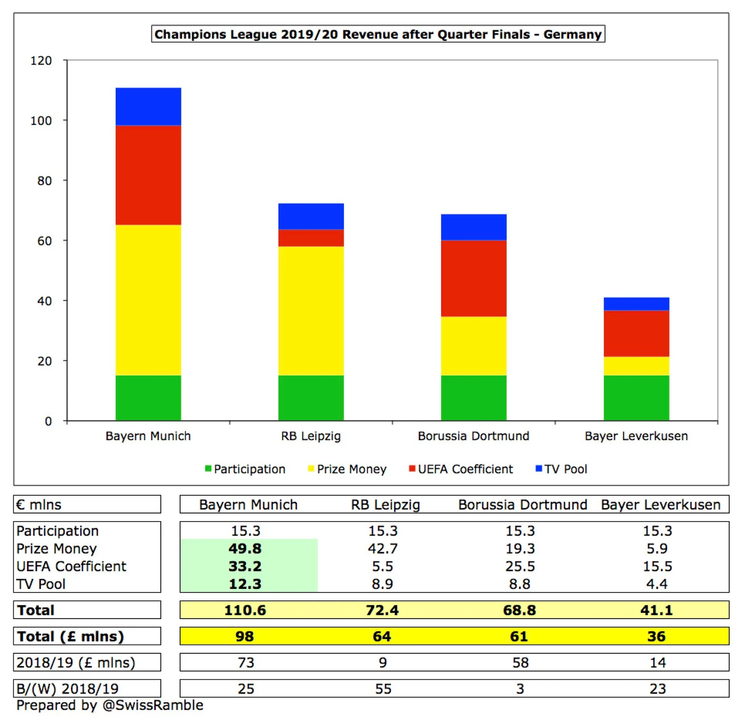 · Ожидаемо, «Бавария» – лучшая среди немцев – мюнхенцы уже получили 111 миллионов евро. С большим отставанием идут остальные представители Бундеслиги: «Лейпциг» заработал 72 миллиона евро (стоит учитывать низкий коэффициент клуба), «Боруссия» – 69 миллионов и «Байер – 41.