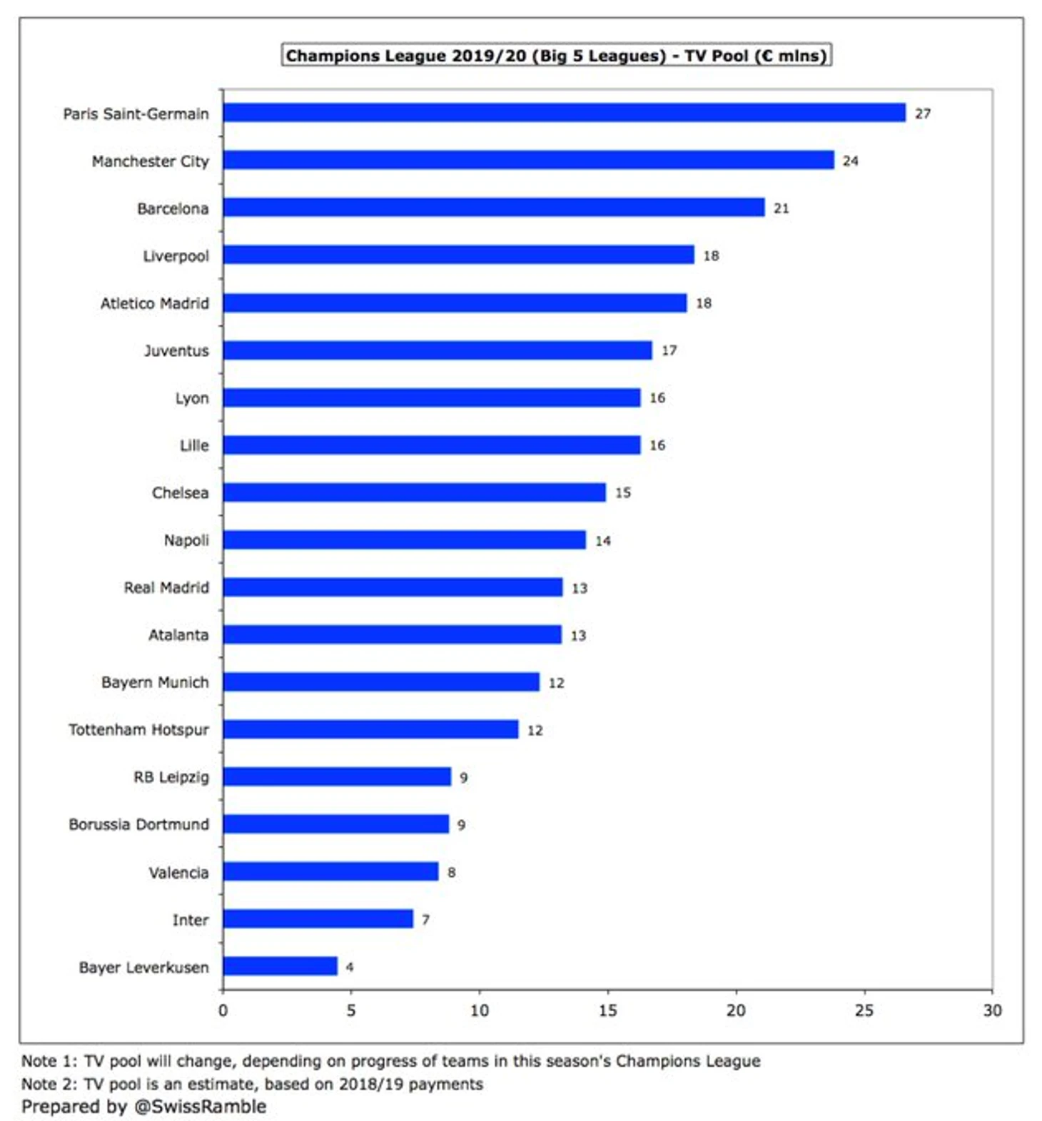 · Цифры за телеправа оцениваются в соответствии с платежами по странам за сезон 2018/19. Исходя из этого, «ПСЖ» и 27 миллионов – лучший показатель в нынешнем розыгрыше (французский пул делится только между тремя клубами). Следом идет «Манчестер Сити» (24 миллиона), «Барселона» (21) и «Ливерпуль» (18).