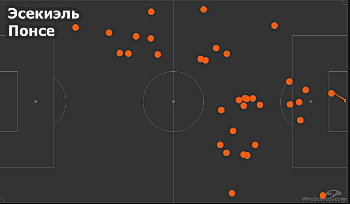 Это карта его касаний мяча - тут скорее работа полузащитника, а никак не страйкера. Всего лишь один удар по воротам, зато сразу результативный. Понсе не самый габаритный парень - в Аргентине в принципе люди невысокие. Но позицию выиграл образцово, открылся правильно, и четко замкнул скидку Соболева. Защитник Ахмата пытался даже трусы с него стянуть - сил не хватило. Спасибо Роману Зобнину за две отличные подачи. И спасибо Айртону за реактивные забеги, которые приходилось гасить только фолами, после чего и пришли эти спасительные стандарты.