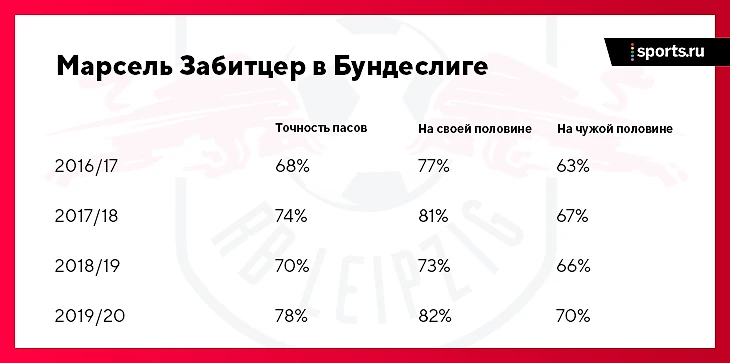 По количеству ударов по воротам за игру Забитцера обошли только Вернер (3.92) и Шик (3.63), а по количеству пасов, которые приводят к ударам по воротам, – только Нкунку (2.15 против 3.43). При Нагельсманне большую роль стала занимать игра с мячом, отсюда закономерный рост в точности передач.