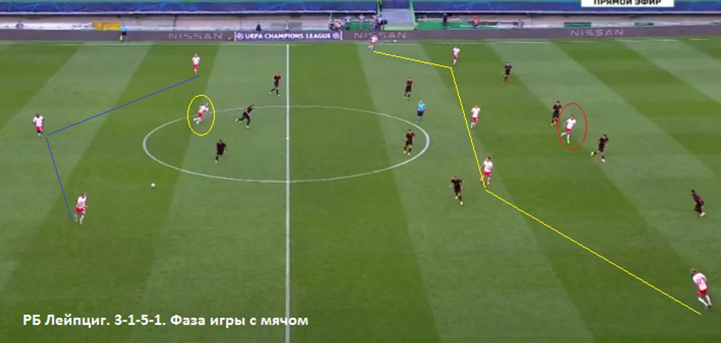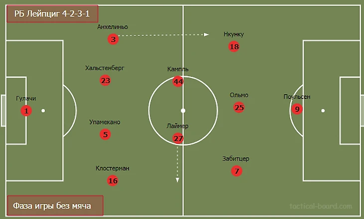 "Лейпциг" был менее предсказуемым в плане тактической схемы и системы игры. В фазе игры без мяча команда Нагельсмана играла в 4-2-3-1, с мячом перестраивалась в оригинальные 3-1-5-1. Временами немцы в обороне переходили на хорошо им знакомые 4-4-2. Перестроение между фазами осуществлялось за счет смещения левого защитника вперед по флангу. Анхелиньо закрывал левый фланг. Опорник Лаймер оперативно переквалифицировался в правого латераля. В обороне оставалась тройка защитников.