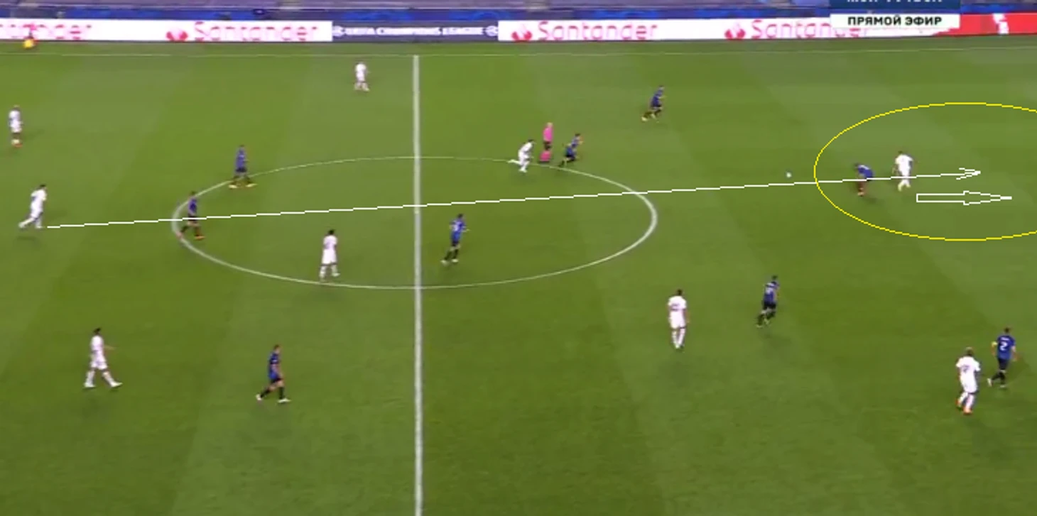 На скриншоте выше - пример быстрой атаки с игрой через Неймара. Неудачные попытки прессинга со стороны бергамасков приводили к регулярному образованию разрывов между искаженными линиями и свободным зонам. Бразилец в одно касание обыгрывается с партнером и атакует свободное пространство за спиной защитника.