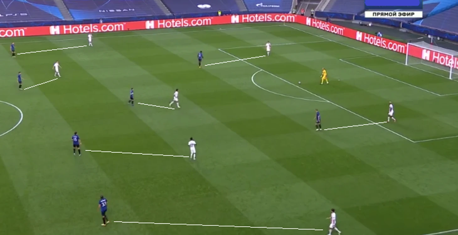 Париж строил свои позиционные атаки через длинные передачи на Неймара во второю треть поля. Персональные ориентировки "Аталанты" гарантировали бразильцу достаточно пространства в середине поля, так как семеро полевых игроков итальянского клуба накрывали своих "клиентов" на половине поля французов, а Неймар, Сарабия и Икарди оставались под присмотром тройки защитников. Структура прессинга "Аталанты" оставляет вратаря команды соперника свободным и именно Навас, без давления часто исполнял подготовленные длинные передачи на Неймара, который благодаря своей технике играл в одно касание на партнеров или останавливал мяч и шел в обыгрыш. Индивидуальные проходы Неймара создавали очень большие проблемы обороне "Аталанты" и если бы не низкая реализация голевых моментов, то "ПСЖ" вполне мог не доводить дело до валидола и одержать гораздо более прозаичную победу.