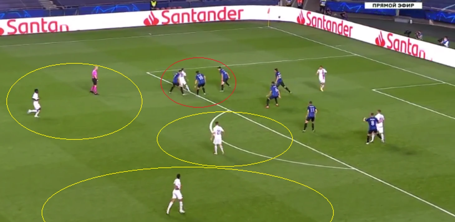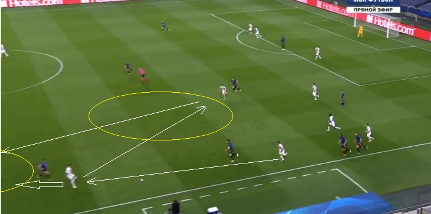 Узкое расположение тройки хавбеков под форвардом обеспечивала "РБ" свободу на флангах. Команда Нагельсмана много и разнообразно комбинировала, используя разные по длине и направлению передачи, перегружала определенные зоны, создавала изоляции, при потерях на половине поля соперника качественно использовала контрпрессинг. Этот аспект и перегруз стратегически важных зон оказались серьезным козырем Нагельсмана в игре с Симеоне.