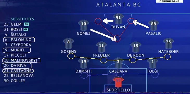 "Аталанта" играла не в 3-4-2-1, а 3-4-1-2. Впереди Сапата и Пашалич, под нападающими - Гомес. Это традиционный модуль под оппонента с двумя центрбеками и одним опорным.