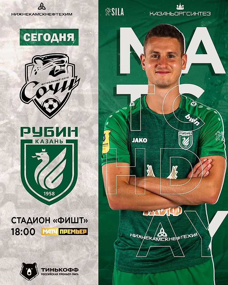 Смотрим дальше: оба клуба используют сложные фоны (геометрия плюс флаг у «Сочи», старая фотография с эффектом бумаги плюс зеленая ткань у «Рубина») и играют с надписями. Надписи, кстати, вызывают вопросы. Защитник «Сочи» Эльмир Набиуллин перекрывает головой часть фоновой надписи, и при быстром взгляде на картинку можно прочитать «ужин» или «убить», или что угодно еще, но точно не «Рубин». А самому «Рубину» за покраску плюс – текст одновременно и за Оливером Абильдгором, и перед ним, это классно – но за расположение «MA TC HD AY» столбиком жирный минус. Да, в других форматах картинки, например, в Твиттере, надпись выглядит более удобоваримой, но стоило ли оно того?