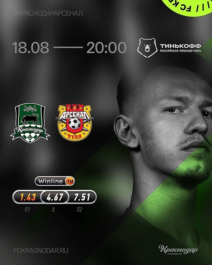 Что мы видим? Эмблемы клубов-противников, их названия сверху хэштегом, в рамках какого турнира проходит встреча – логотип РПЛ, и еще пара уточнений в трех углах из четырех – это «Краснодар»! Точно-точно.