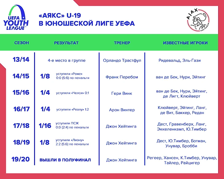 «Аякс» давно славится своей академией. Но в Юношеской Лиге УЕФА каких-то особенных достижений пока нет. А ведь в этом месяце завершится уже седьмой розыгрыш турнира. Причины слабых результатов амстердамцев разные. Тут и тренерские чудачества, и постоянные перестановки в составе. Да и элемент невезения есть. Точнее, был.