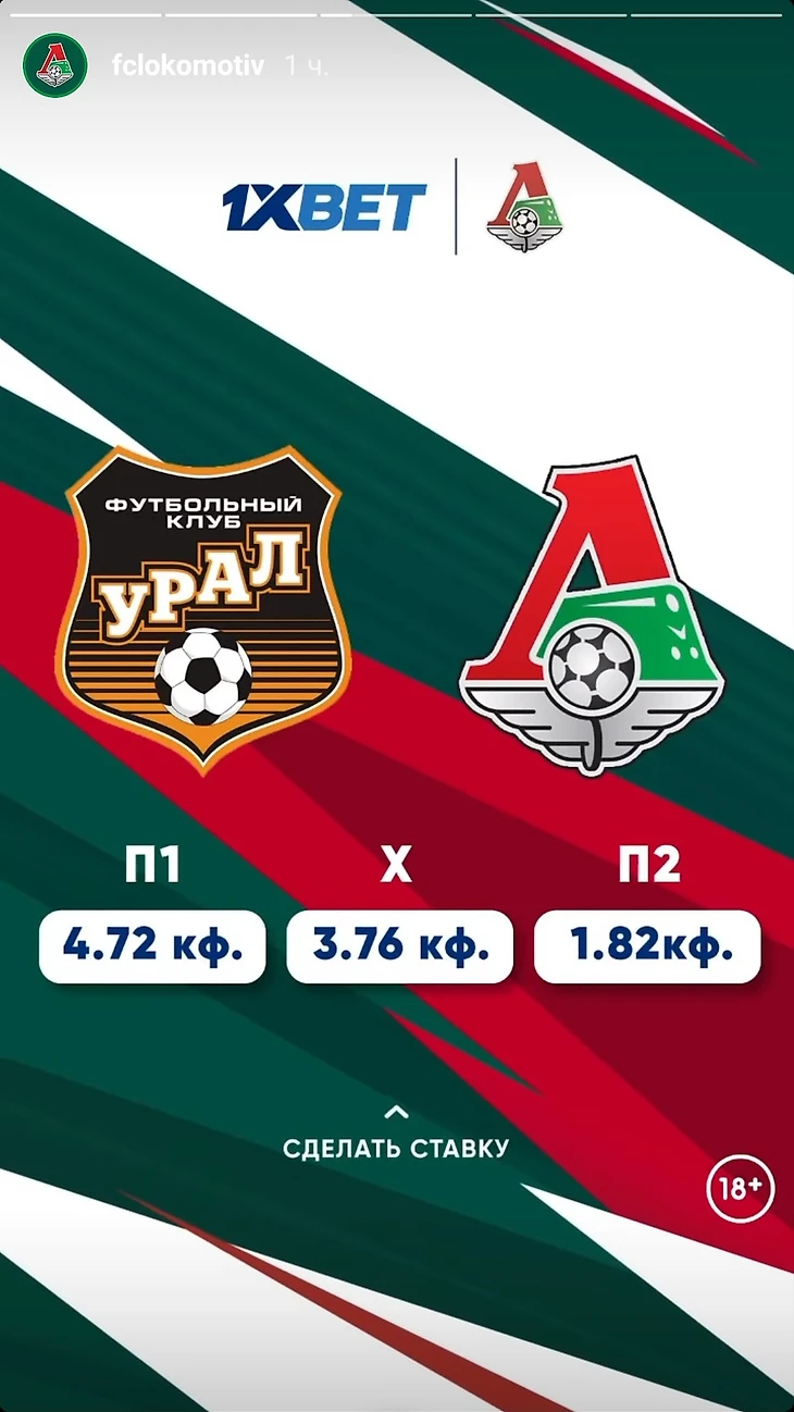Хотя стойте! Ставки как раз есть, ведь 1xbet официальный партнер «Локомотива». Только размещены они на отдельной публикации в сторис клубного инстаграма. Зато сразу со свайпом.