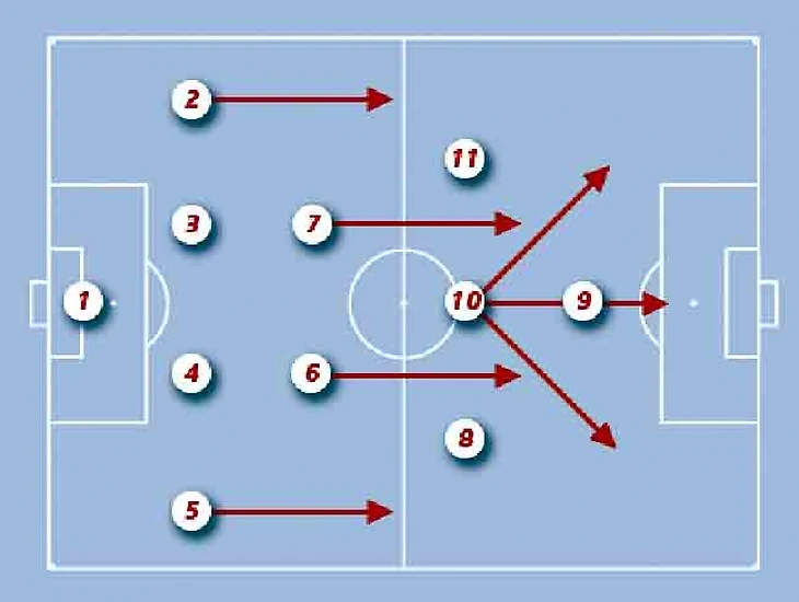 На первый взгляд эта формация выглядит сугубо оборонительной, однако на самом деле она очень гибкая, так как 3 полузащитника в определённый момент могут быстро перейти в атаку вместе с центральным форвардом.
