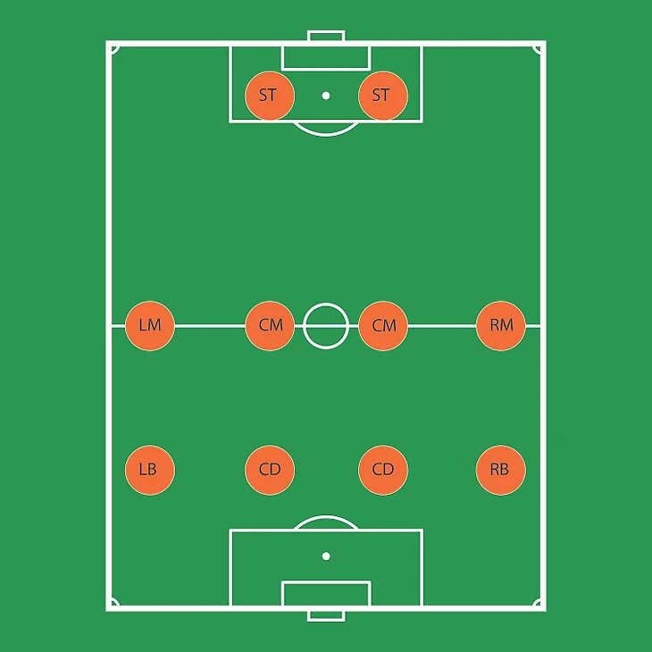 Но это может быть и один из фланговых полузащитников, когда нужно обеспечить количественное равенство в центре поля. Два центральных полузащитника играют на оборону, а крайний полузащитник играет в середине. А впереди у команды с 4-4-2, кстати, целых два форварда.