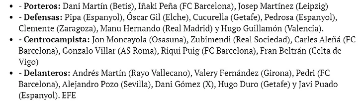 Много новых имен в заявке сборной U-21 можно связать с тем, что многие важные игроки вызваны в главную сборную Луиса Энрике: Торрес, Гарсия, Оскар, Фати и Ольмо.