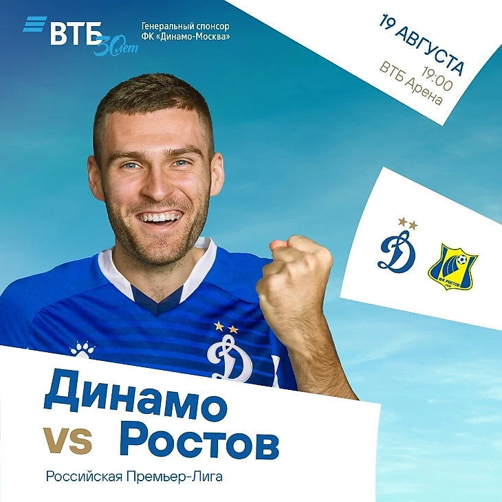 Постер простенький и симпатичный — выдержан в новых основных цветах клуба, к белому и голубому добавлен золотой. Кажется, что на постере много места и мало информации, но на деле есть все необходимое, даже спонсору нашлось место. Нет разве что телеканала и стилизованного медведя РПЛ, но это уже вещи, как говорится, опциональные.