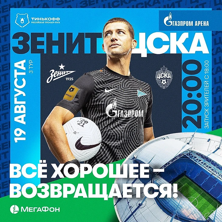 Четыре элемента в сложном фоне (зеленый цвет сине-бело-голубым привнес спонсор — «Мегафон») не спорят между собой и не перетягивают внимание с главного: