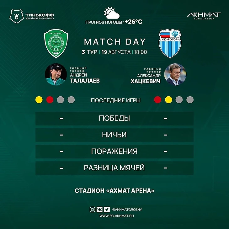 Это единственный клуб, который на основном постере разместил информацию о главных тренерах и статистике личных встреч клубов (везде прочерки, потому что грозненцы играли с «Ротором» в первый раз). Соцсети клуба, результаты последних матчей, погода и порядковый номер тура тоже являются не самыми популярными элементами. В сумме все это делает плакат «Ахмата» практически уникальным. Минимум «красивостей», максимум информации — таков клубный замысел.