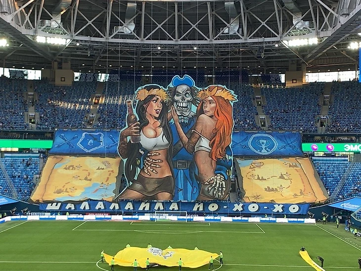 Но больше, чем про игру, говорят про гениальный перфоманс фанатов Зенита, где дряхлый пират мацает двух полураздетых девушек. И у меня возник вопрос, допустим ли такой перфоманс на матче тура и на главном стадионе страны (не Лужники же им считать, где давным давно не играли?)