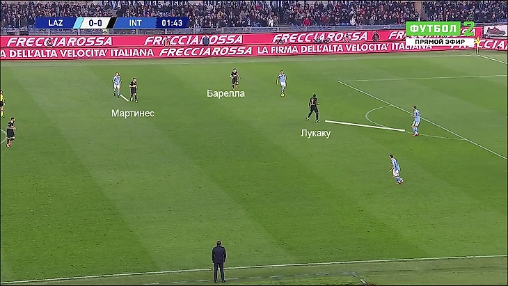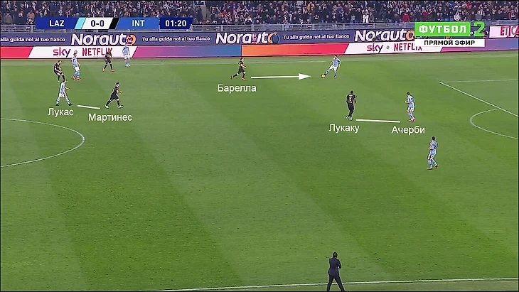 Другой пример – игра с «Лацио». Здесь была схема 3-5-2, а Конте нужно было накрывать сразу трех центральных защитников соперника. Он насытил центр работягами. Под эту задачу вышли Барелла и Весино. Лаутаро Мартинес и Ромелу Лукаку были статичными и играли персонально по Лукасу Лейве и Франческо Ачерби, а двух других защитников поочередными выдвижениями прессинговали Барелла и Весино.