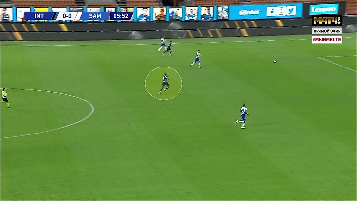 А вот матч с «Сампдорией». Схема 3-4-1-2 – с Кристианом Эриксеном под нападающими. Тут приоритетная задача Бареллы – отработка за датчанином. Лукаку указывает, что паре нападающих нужна поддержка в прессинге: