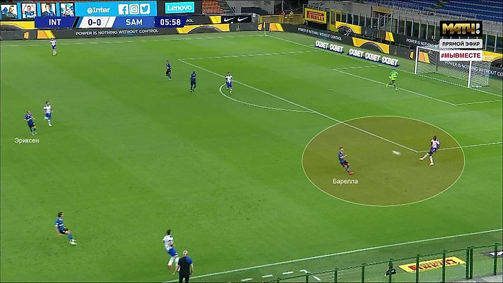 Чтобы обеспечить ее, Барелла делает резкий рывок (Эриксен экономит силы, а прессинг не разваливается):