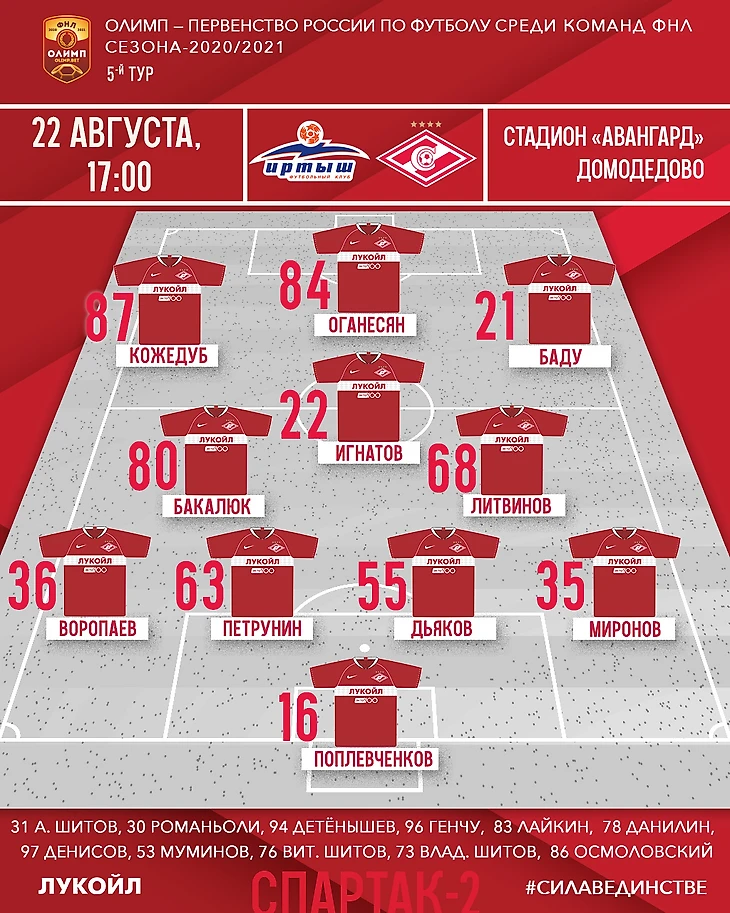 «Спартак-2»: Поплевченков, Миронов, Дьяков (к), Петрунин (Детёнышев, 81), Воропаев, Литвинов (Денисов, 72), Бакалюк (Лайкин, 78), Игнатов (Данилин, 72), Баду, Кожедуб (Влад. Шитов, 60), Оганесян.