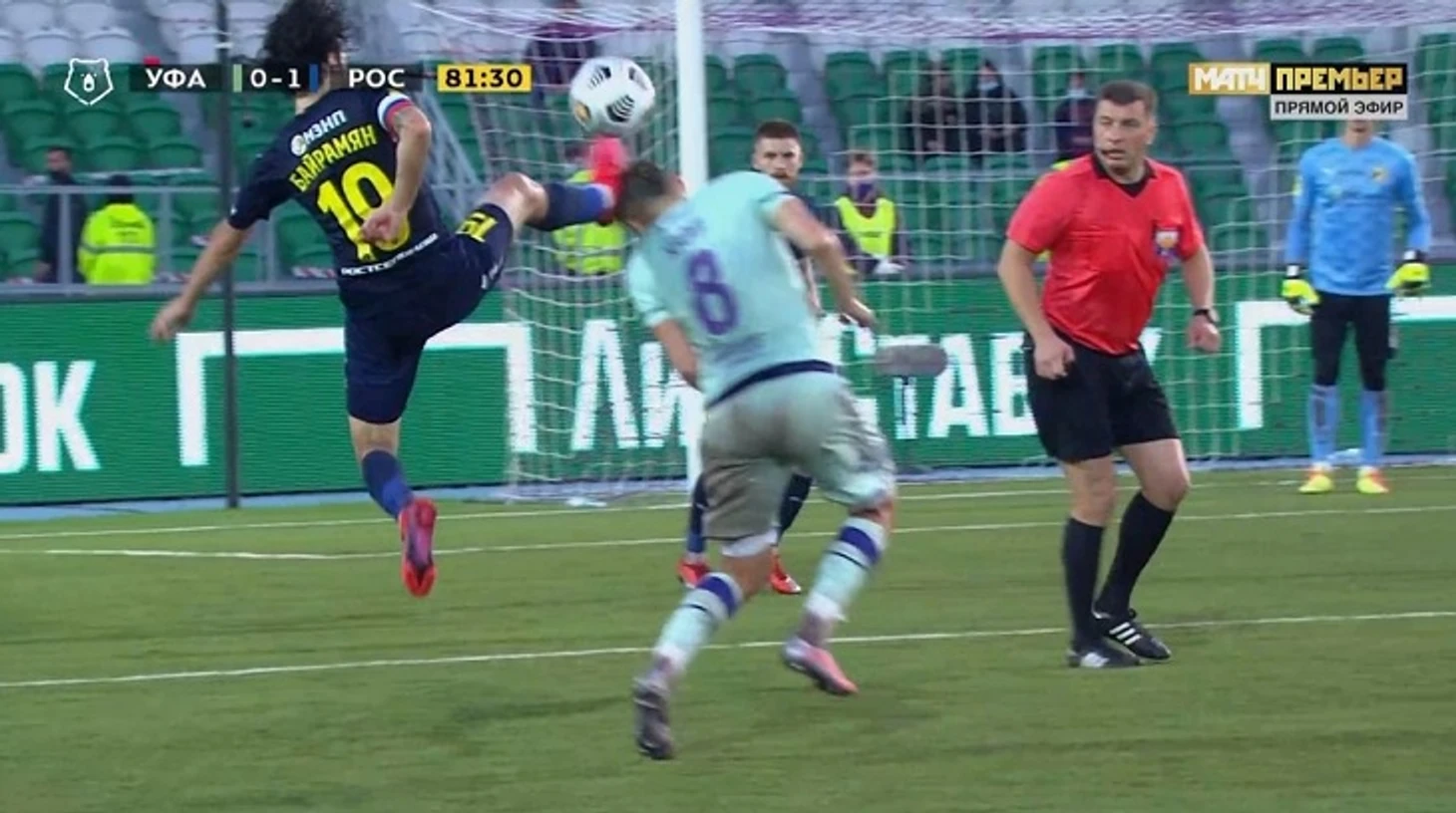 Это 82-я минута, «Уфа» уже проигрывает. Хорен Байрамян взлетел над полем и правой бутсой проехался по голове Карпа. Обратите внимание на Вилкова в кадре: судья хорошо видит эпизод, Байрамян получил желтую.