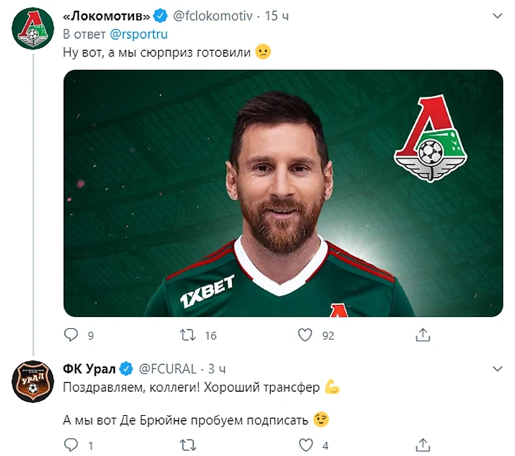 СМИ всегда нас начинают информировать о заинтересованности клуба в игроке(мы можем понять это по прошлому шуточному фото). По этому примеру вы должны понять,то, что и ''Локо'' и Урал заинтересованны в услугах Месси и Де Брюйне, но надо понимать, что все клубы хотят видеть этих футболистов в своём клубе.