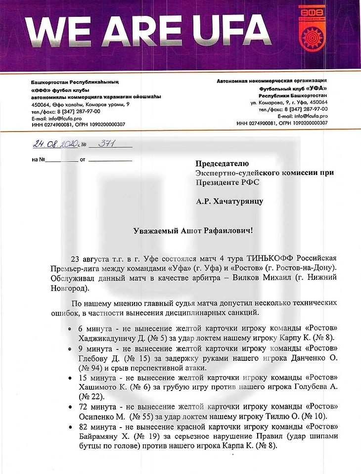 Получается "Уфа" начала битву за честный футбол? Мы все конечно только за! Но на , что жалуется "Уфа"? Разве ранее их судили плохо? Вот официальное письмо главе судейского комитета РФС Хачатурянцу.