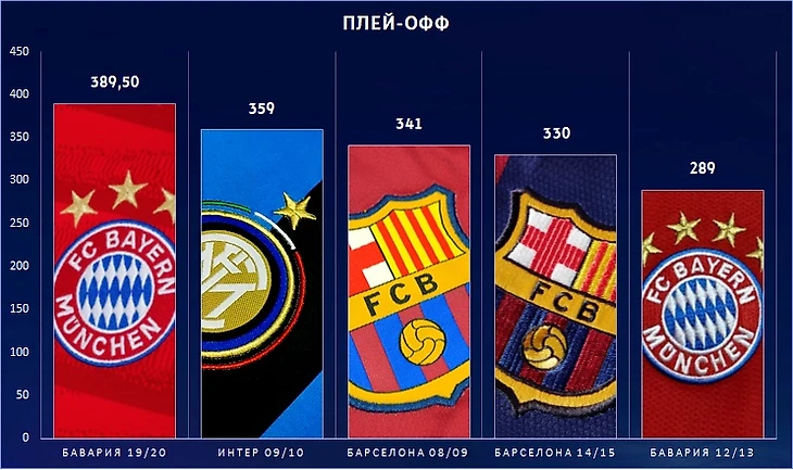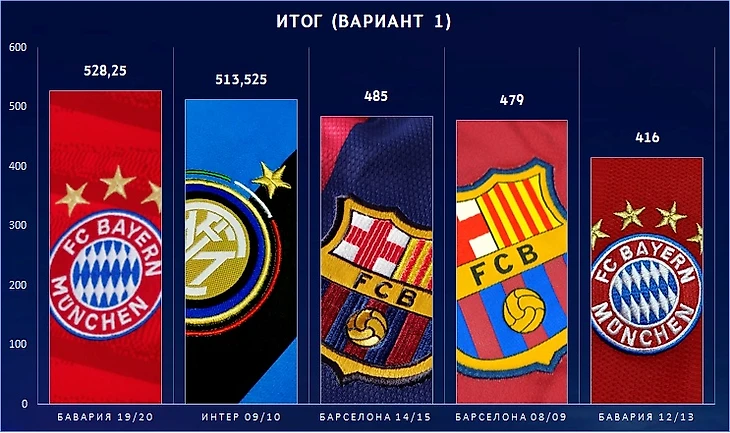 Итак, вновь фавориты комментаторов опроса (Барселона 08/09 и Бавария 12/13) не в лидерах. У Баварии и вовсе были самые слабые (по рейтингу) соперники из представленных участников. А вот Бавария 19/20 сражалась с более сильными командами - и победила каждого из них. Нельзя не отметить и Интер - и в плей-офф у итальянцев второй результат.