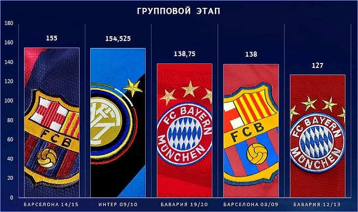 Наконец, самый свежий обладатель требла - Бавария Флика (128, 3 место) - выбила на этом этапе шесть побед из шести возможных против Тоттенхэма (78), Олимпиакоса (44) и Црвены Звезды (16,75). Общий рейтинг соперников баварской команды составил 138.75 очков, а средний показатель - 46.25 (на начало сезона это примерный уровень Атлетика из Бильбао или Андерлехта).