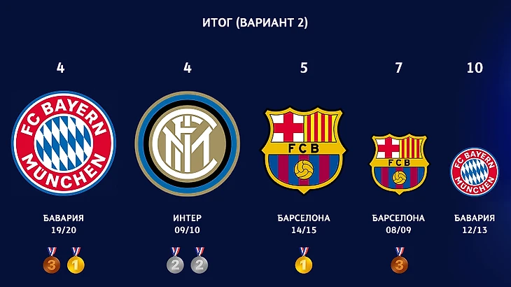 Во всех представленных случаях Барселона и Бавария либо побеждали, либо играли с будущим победителем ЛЧ. Более того, тот из них, кто побеждал соперника, в итоге забирал золотые медали. На этом фоне особо выделяется Интер, победивший и испанцев, и немцев.