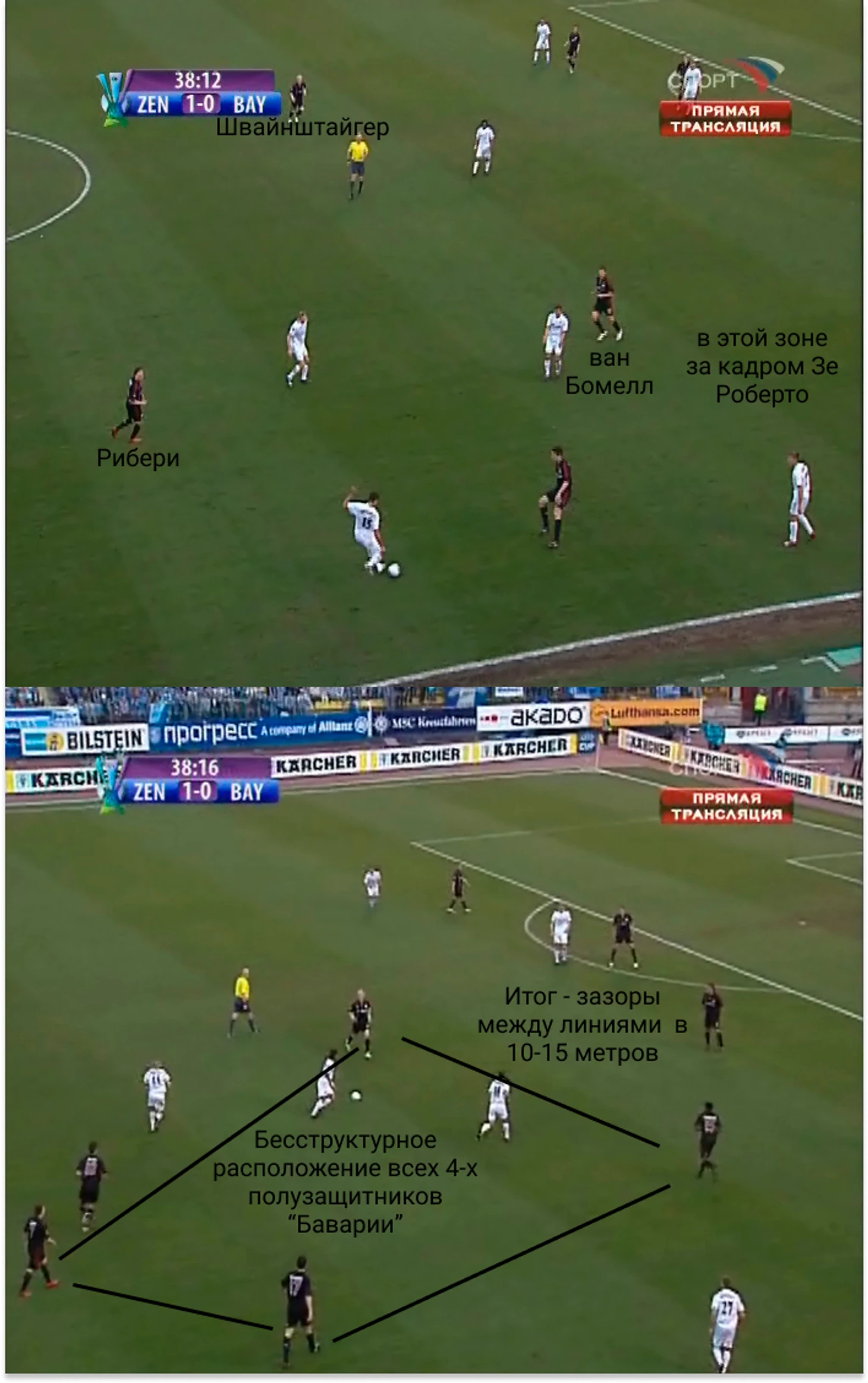 Далее мюнхенцы давили, но были лишены пространства: «Зенит» был подвижен и создавал численное преимущество на каждом участке поля, в итоге «Бавария» была вынуждена сбиться на навесы.