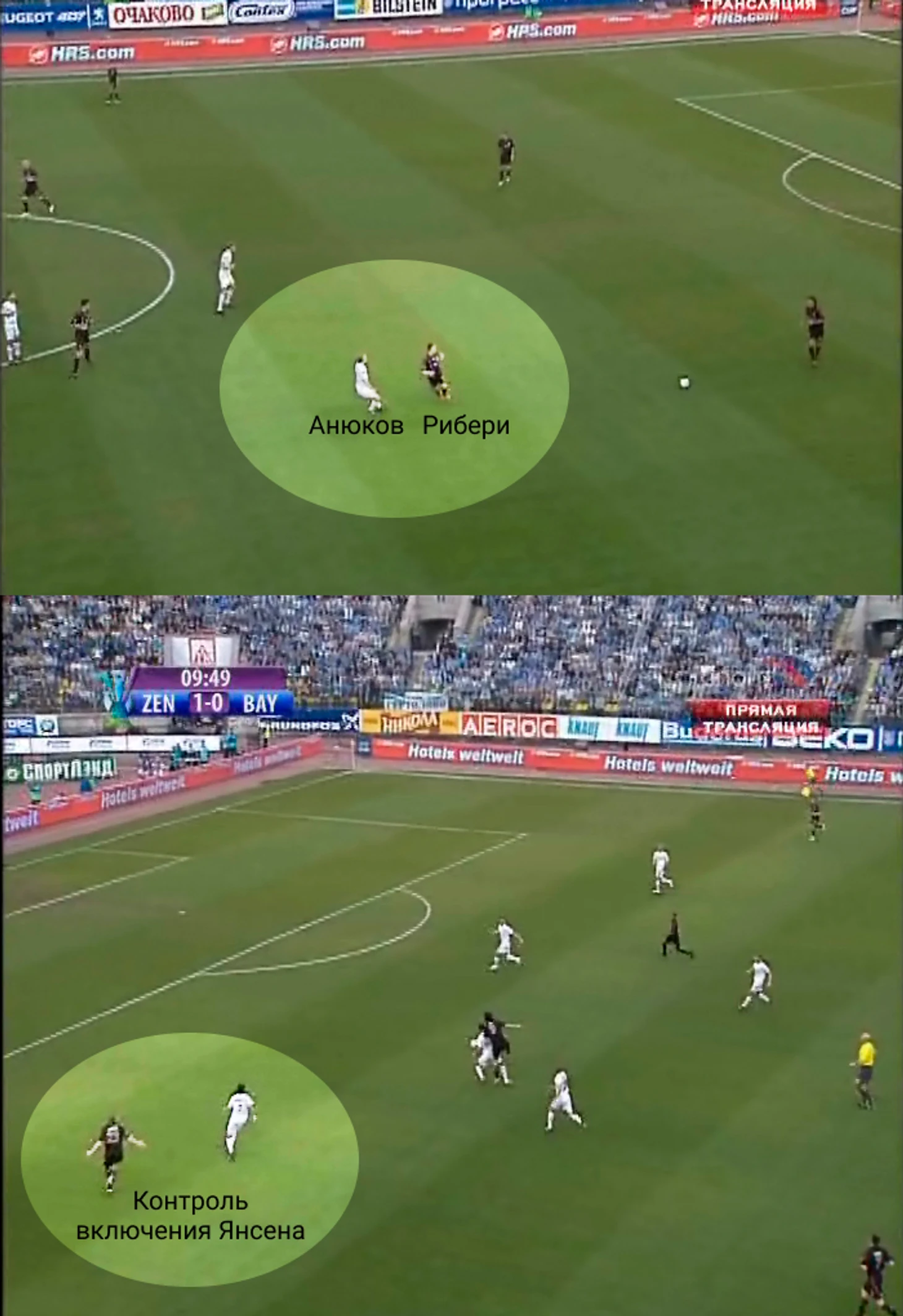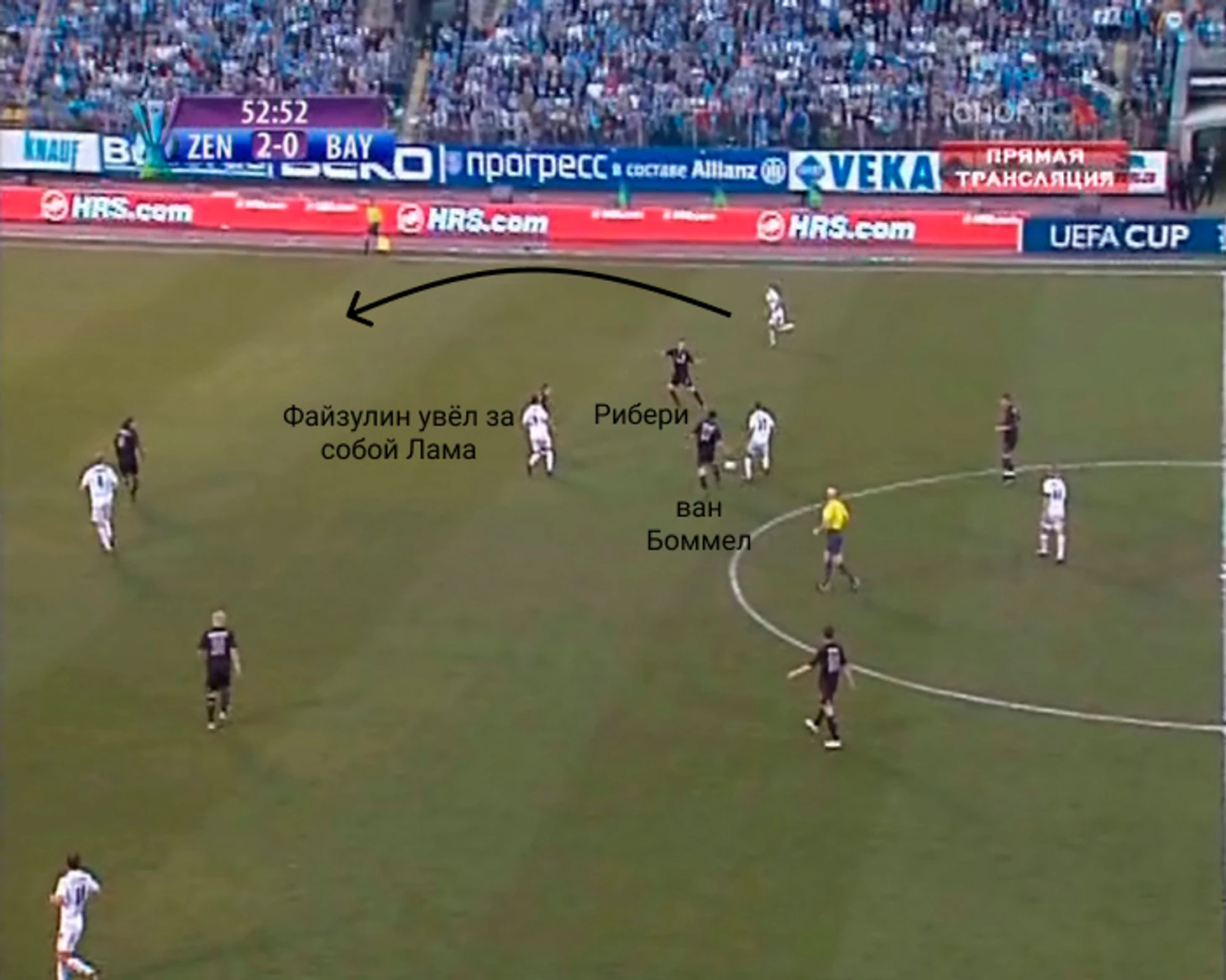 Разберём эпизод. Файзулин увёл Лама практически в центр поля, оголив зону для включения Анюкова. Рибери был к этому не готов, ван Боммел был отыгран, Швайнштайгер отвечал за другую зону.