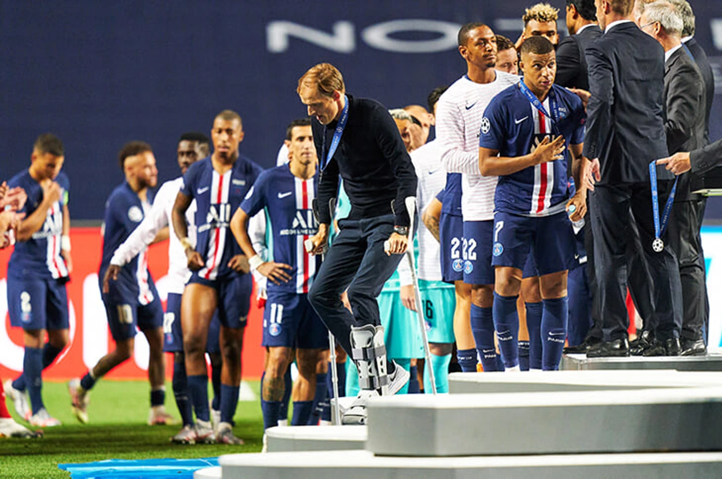 Выразительный взгляд Мбаппе на фоне Томаса Тухеля и костылей.