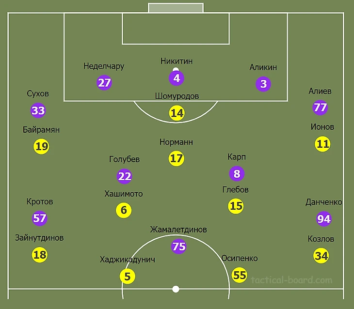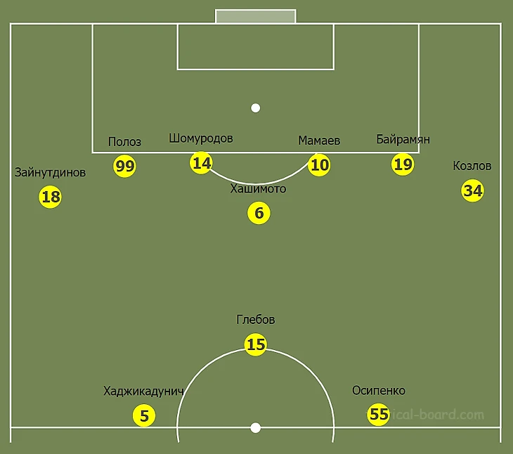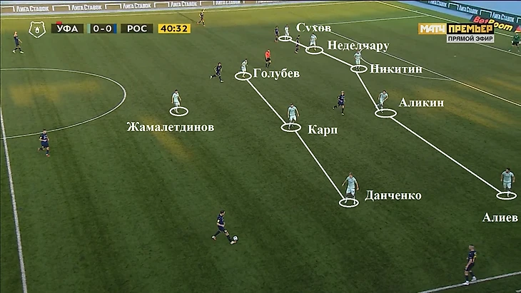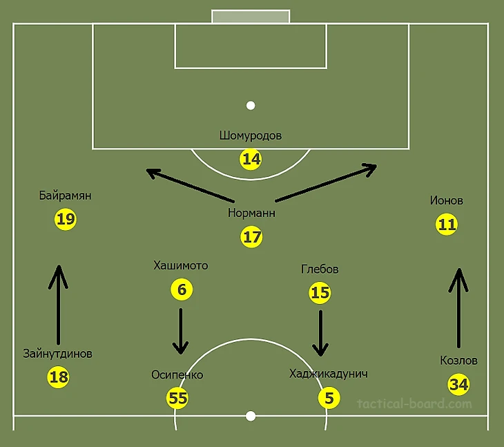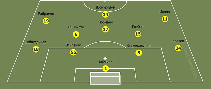 При билдапе «южан» два хавбека (Глебов и Хашимото) сдвигались ближе к центральным защитникам в то время, как Зайнутдинов и Козлов поднимались выше и помогали своим одноклубникам в организации наступательных действий.