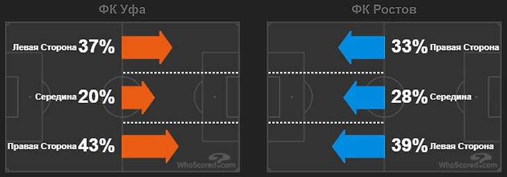С самого начала встречи Ростов забрал инициативу в свои руки и не отдавал её в течение всего матча, за исключением отрезка после забитого гола (владение мячом Уфа 41,2% - Ростов 58,8%). При этом, у гостей возникали проблемы с созданием опасных моментов (до 30-й минуты xG 0,17). Основными направлениями атак обеих команд стали фланги.