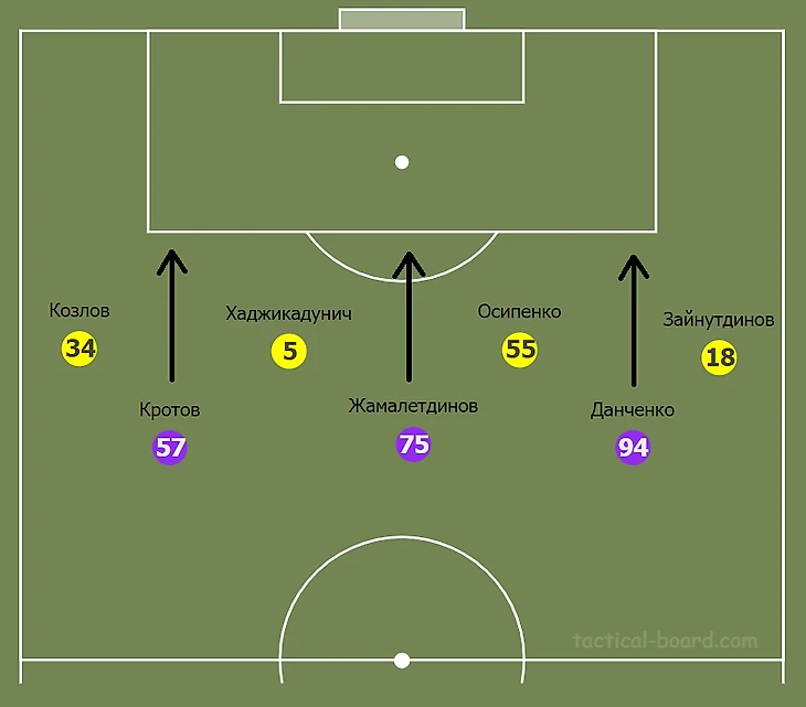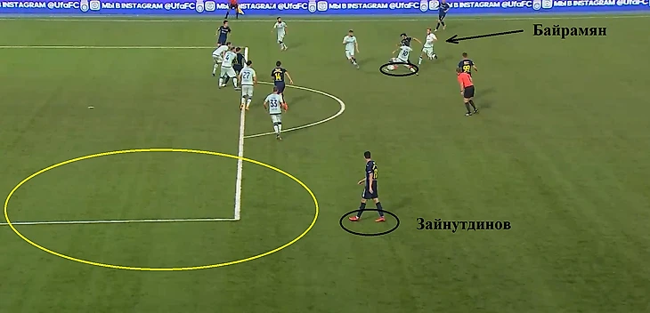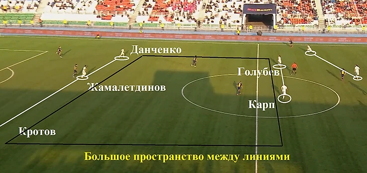 В ответ на это в одном из эпизодов при розыгрыше мяча от ворот, команда Валерия Карпина решила «выманить» на себя тройку башкирского клуба и, увеличив расстояние между линиями, использовала эти зоны для создания атаки (с которой уфимцы справились успешно).