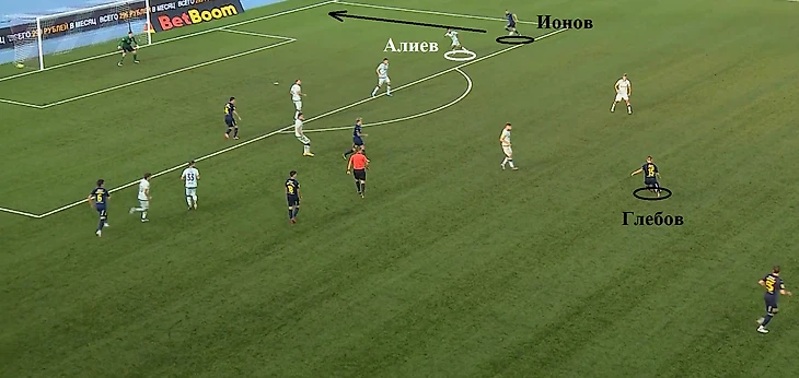 Важно отметить, что изначально ростовский клуб строил свою атаку через левый фланг (именно в данном эпизоде). Как только появилось свободное пространство на противоположной стороне, Данил Глебов сделал длинную передачу на правый край.