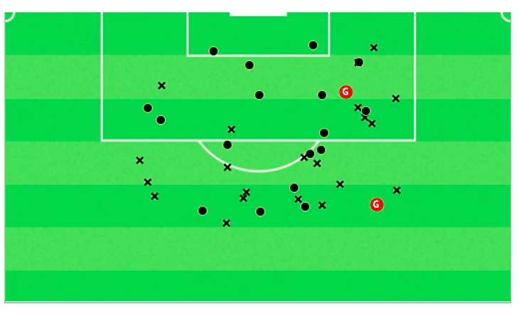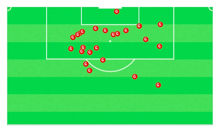А вот точки, с которых он забивал голы в карьере. 5 мячей из-за штрафной, но так издали он еще не попадал.