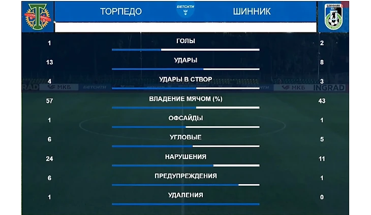 Примечание. На 83-й минуте травму получил и покинул поле игрок «Торпедо» Самсонов. Поскольку лимит замен у команды был исчерпан, она осталась вдевятером.