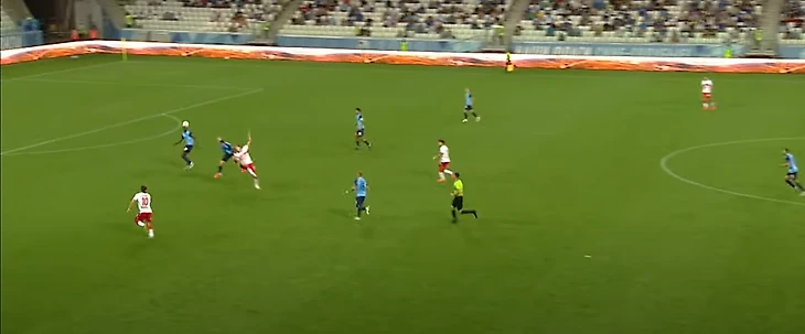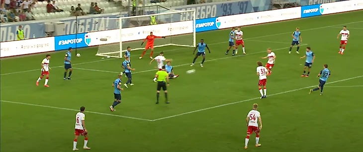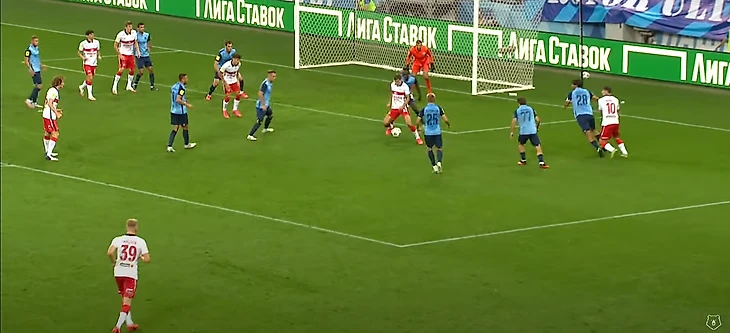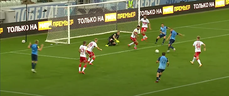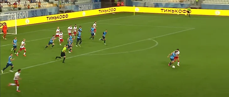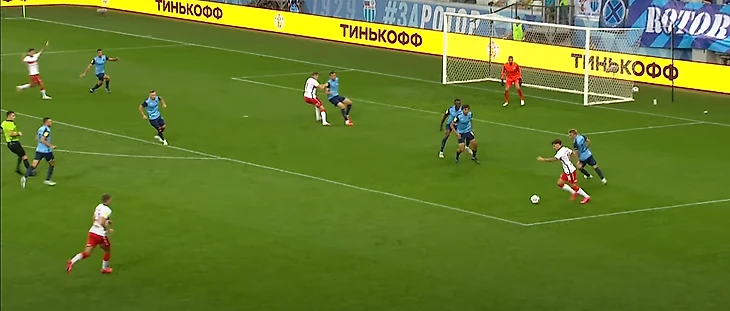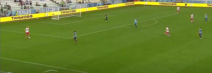36-ая минута: москвичи отнимают мяч на своей половине, Зобнин получает мяч от Крала и делает пас на убегающего вперед Жиго. В момент получения мяча Зобниным за линией мяча было три игрока, плюс Роман отрезал еще двоих. Итого половина команды осталась вне игры