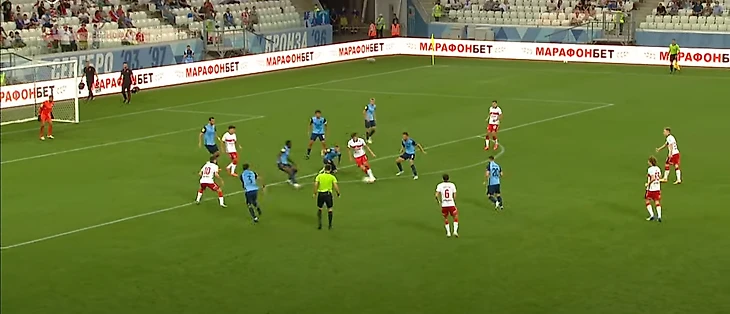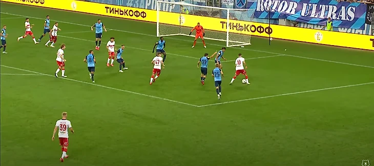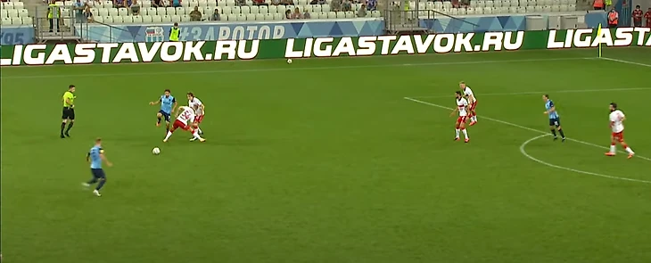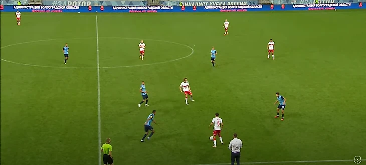 Игрокам Спартака при помощи действий Зобнина и Крала удается выйти из под прессинга. Мяч подхватывает Ларсон. За линией мяча остаются сразу 7 (!) игроков Ротора, для команды, которая явно собиралась играть от обороны, это провал