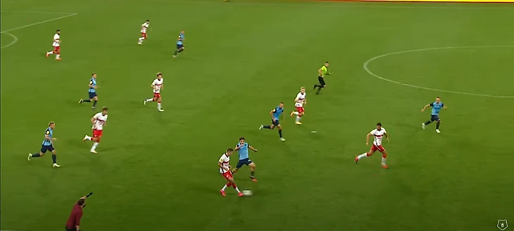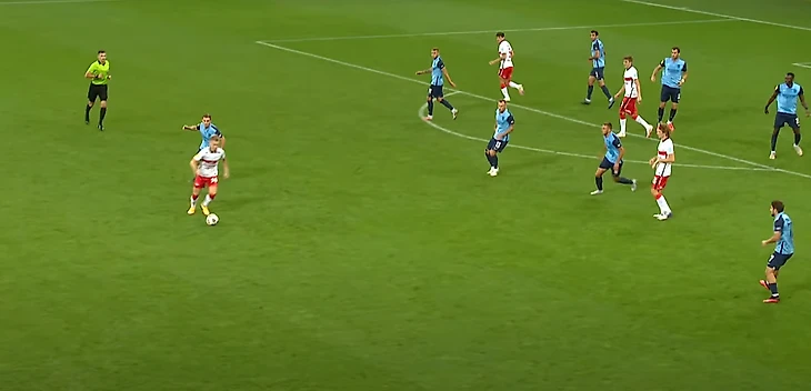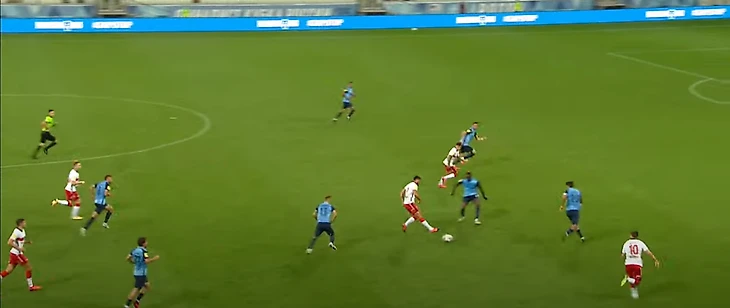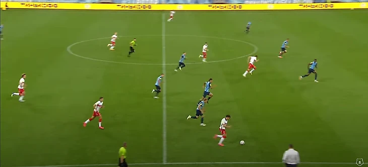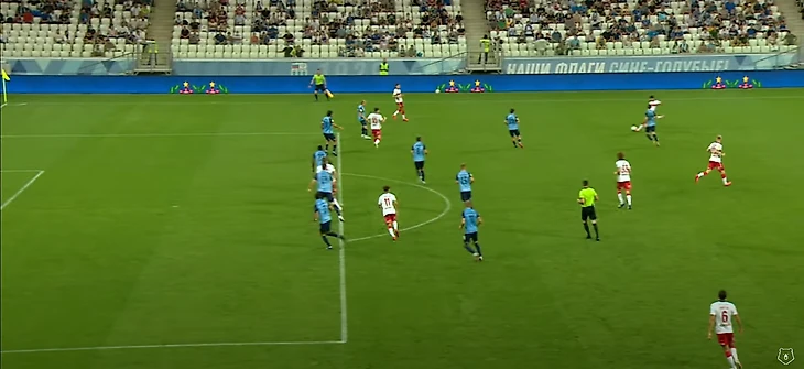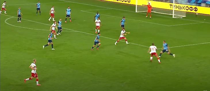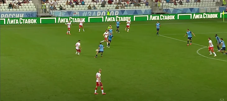 Соболев, находясь спиной к воротам, скидывает на набегающего Бакаева. На этом скриншоте тоже можно увидеть, какие проблемы возникают у высокопрессингующей команды, если сопернику удалось из-под него выйти