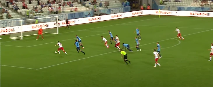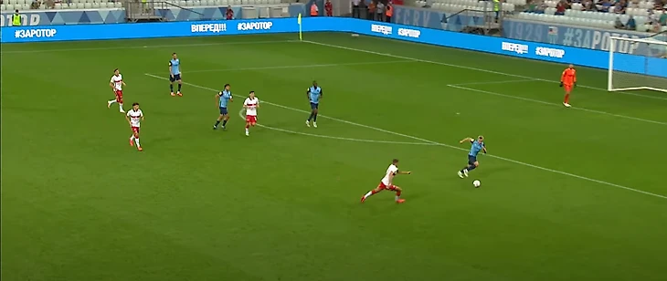 39-ая минута: Умяров делает пас через центр на Зобнина, тот небрежно принимает мяч, который тут же подхватывает Степанов. Перед ним остается только тройка защитников – Крал и Умяров на другом фланге, Зобнина Степанов обыграл на встречном движении