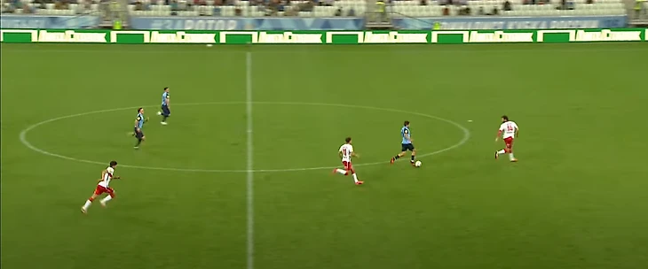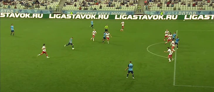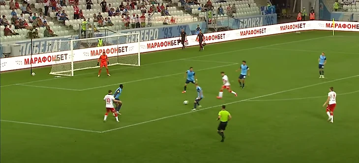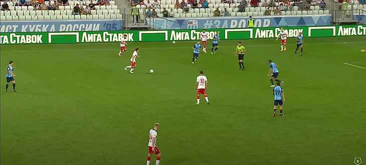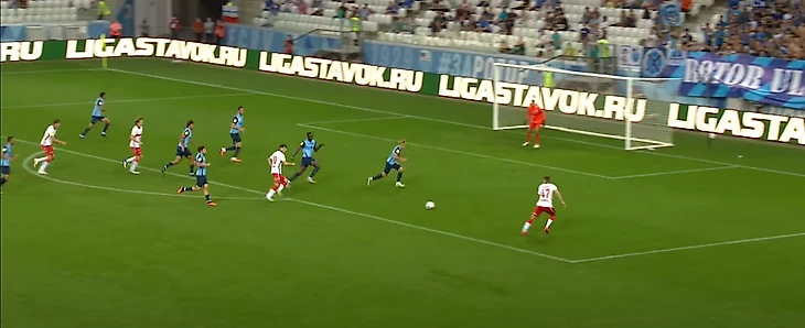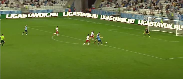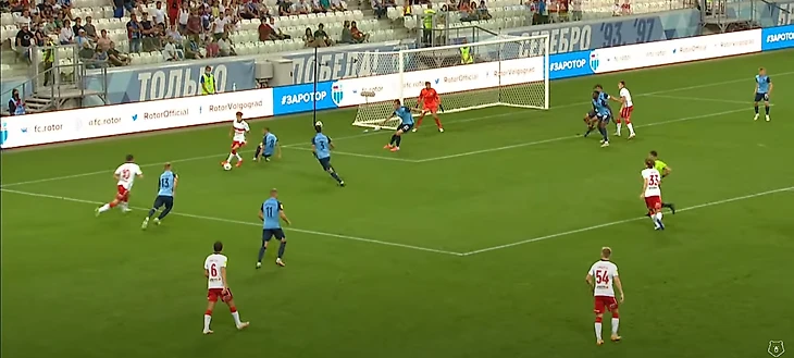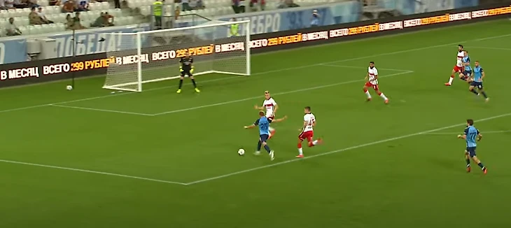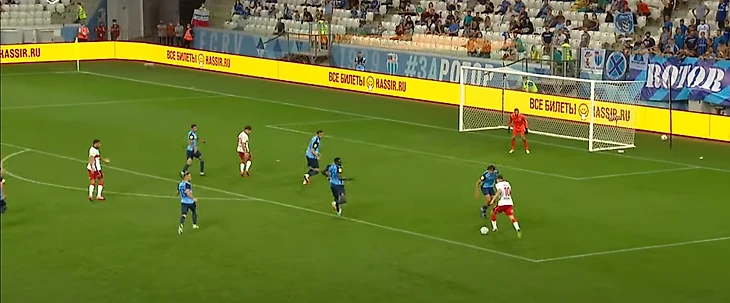 Жиго смещается в центр, вытягивая на себя Гогуа, и отдает пас на Бакаева – ситуация 3-в-3, плюс перед Зелимханом огромная свободная зона и защитники Ротора, бегущие лицом к своим воротам