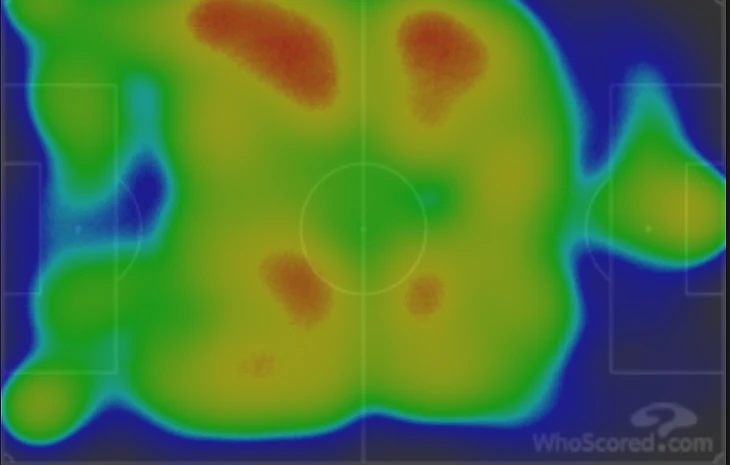 Как мы можем видеть, в новом сезоне Спартак явно тяготеет к атакам через свой правый фланг, можно сказать, что это связано с игрой Романа Зобнина на позиции правого латераля и позицией Ларссона, который тоже тяготеет к правой бровке. Не изменилась картина и во вчерашнем матче. Тепловая карта хорошо показывает более активное использование фланга – Зобнина-Ларссона, при этом нельзя говорить об однобокости атакующей активности Спартака.