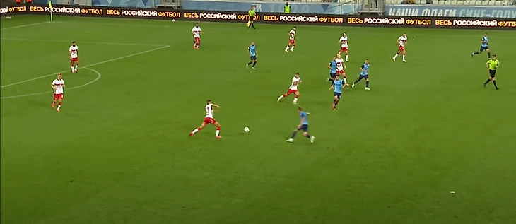 21-ая минута: Умяров получает мяч перед штрафной и пасует направо на Зобнина. Кстати, обратите внимание на свободную зону перед игроком красно-белых, Наиль вполне мог решиться на удар