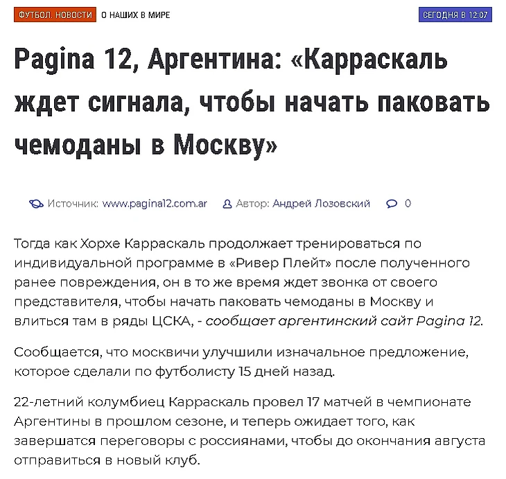 Pagina 12, Аргентина: «Карраскаль ждет сигнала, чтобы начать паковать чемоданы в Москву»
